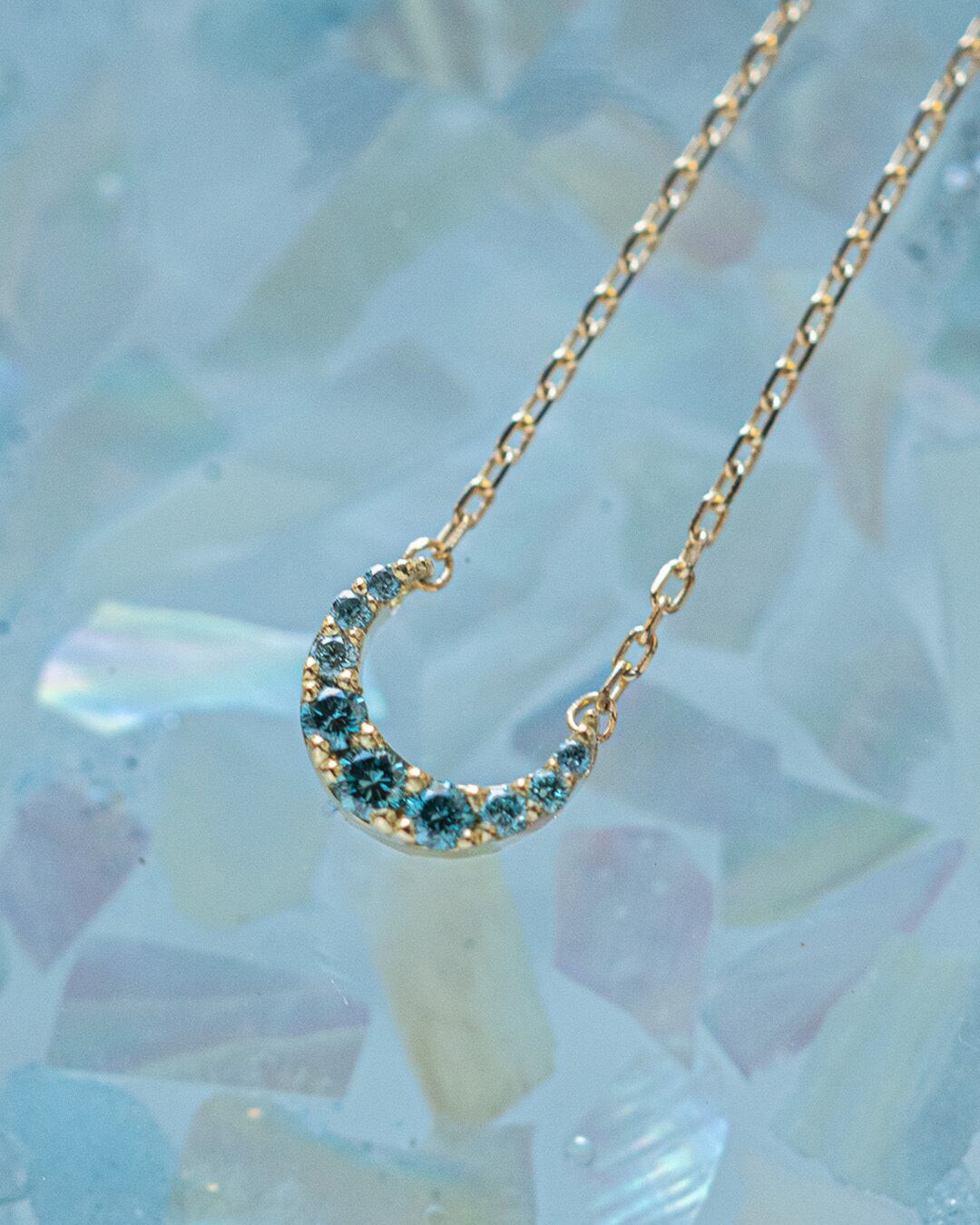 厳選されたブルーダイヤモンドが繊細にセッティングされ、まるで夜空に浮かぶ月のように静かで神秘的な輝きを放ちます。