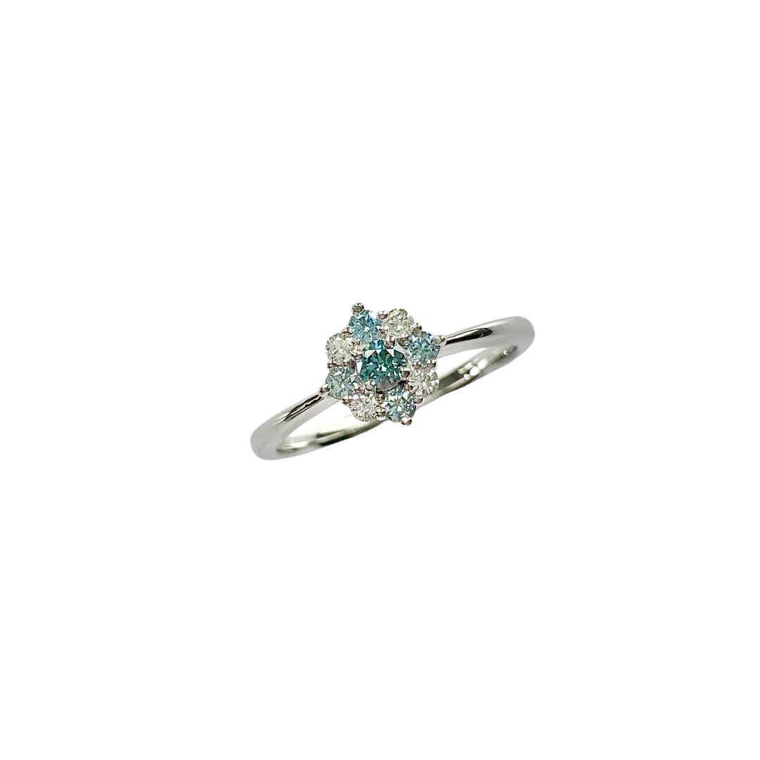 希少なブルーダイヤモンドを使用したPt950製のプラチナリングです。中央には0.09カラットのブルーダイヤモンドが輝き、サイドには0.20カラットのダイヤモンドが美しく配置されています。