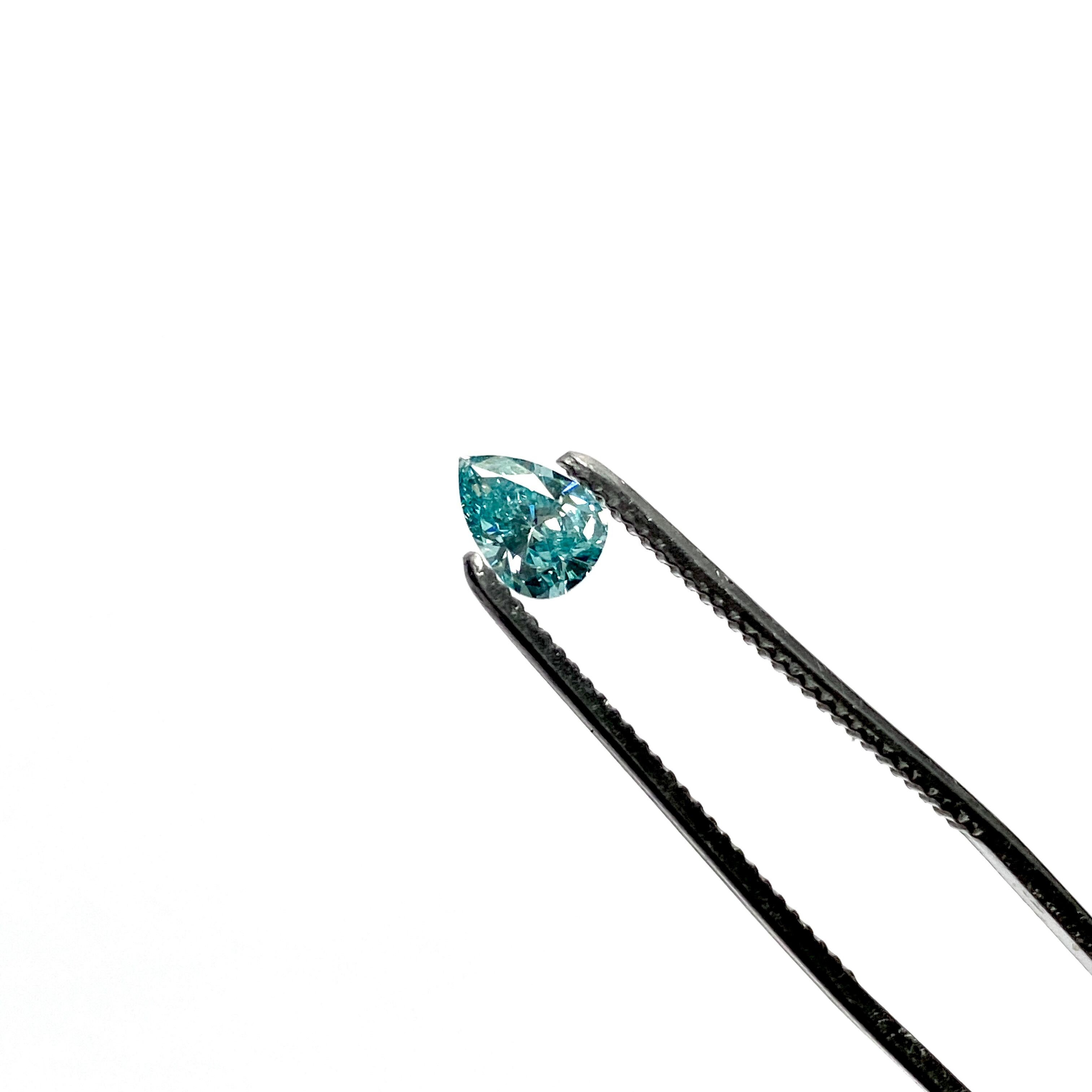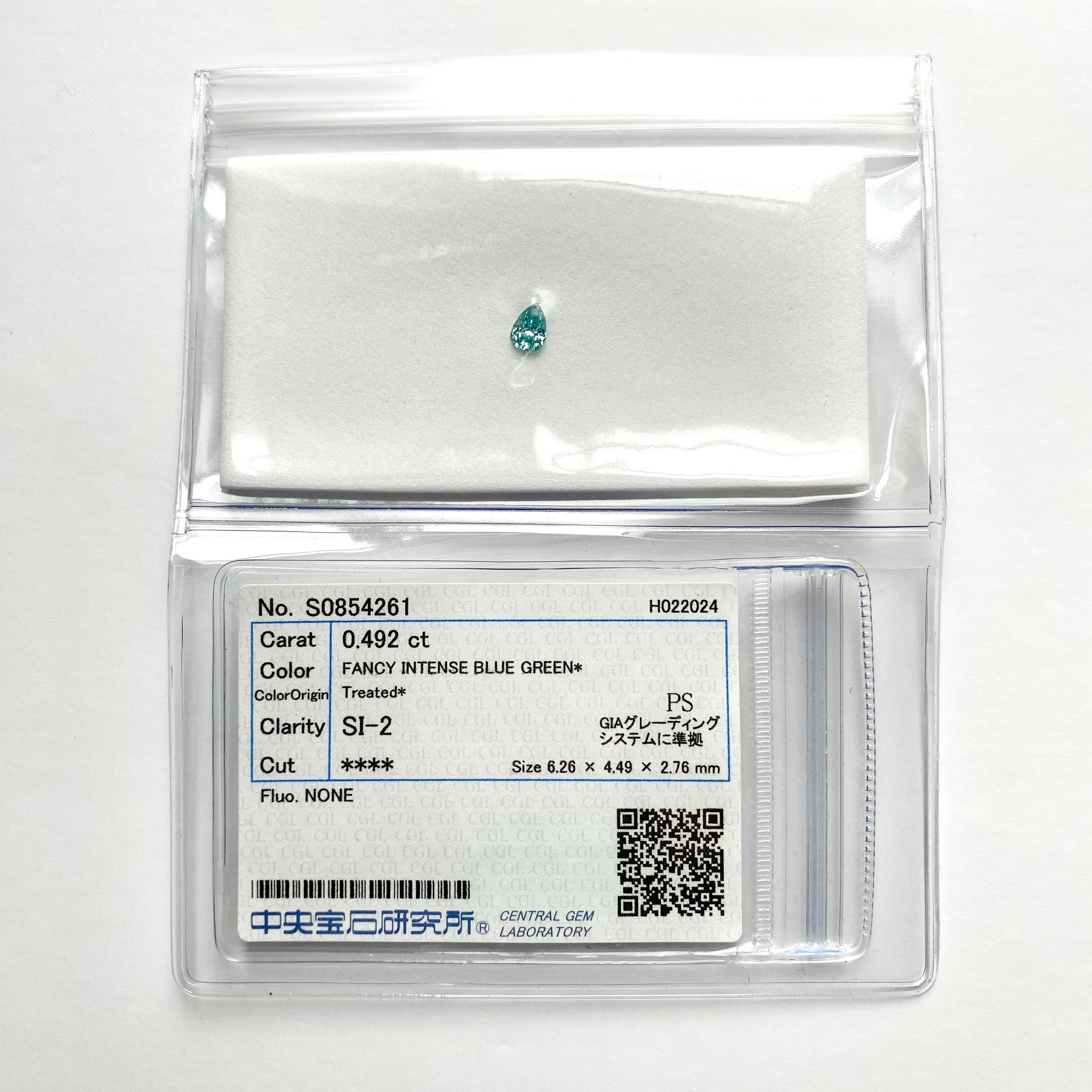 こちらは、0.492カラットのペアシェイプカットブルーダイヤモンドです。ペアシェイプカットの優雅なフォルムが、クラシックでありながらも洗練された印象を与えます。このダイヤモンドは、特別なトリートメントにより鮮やかで深みのあるブルーカラーが引き出され、独特の輝きを放ちます。