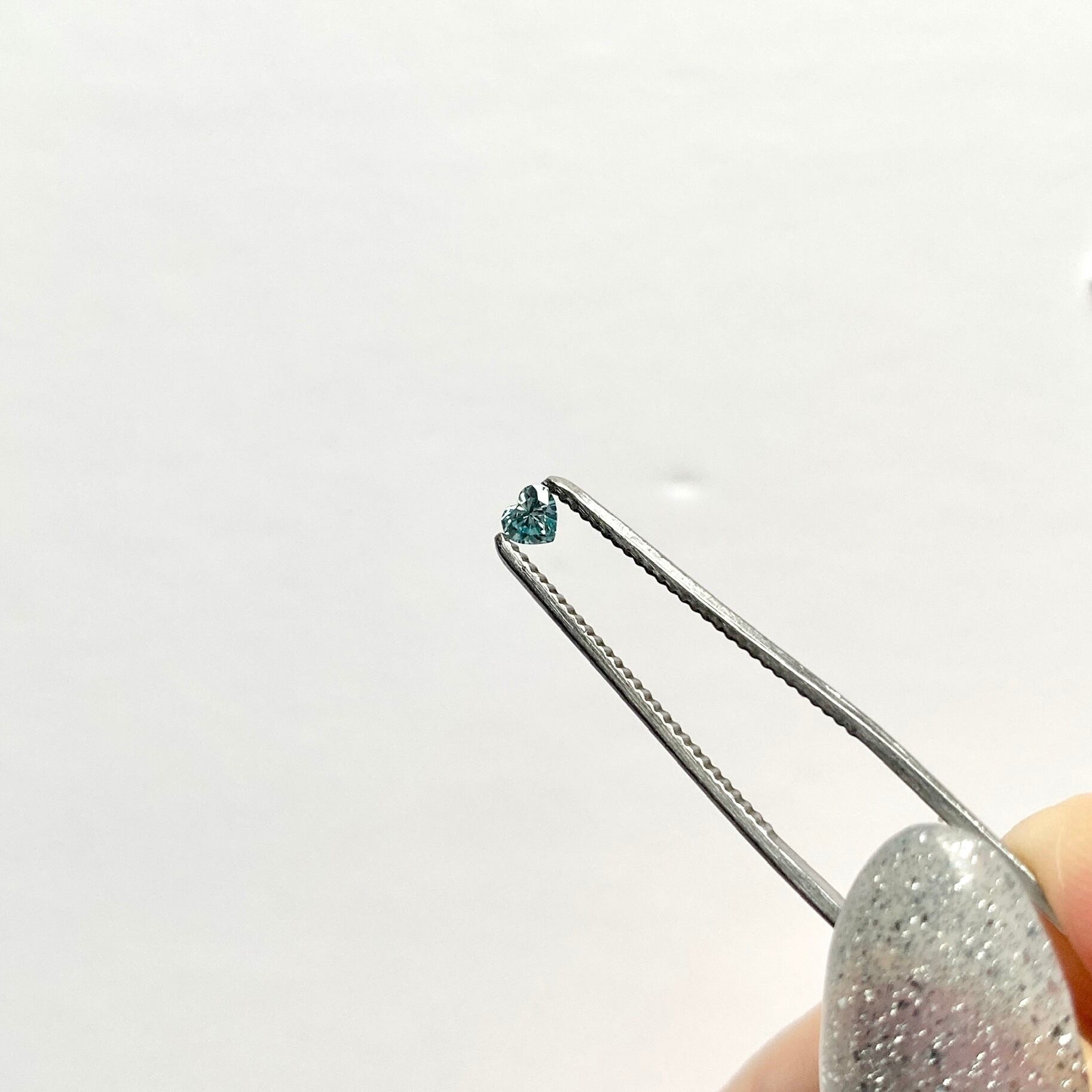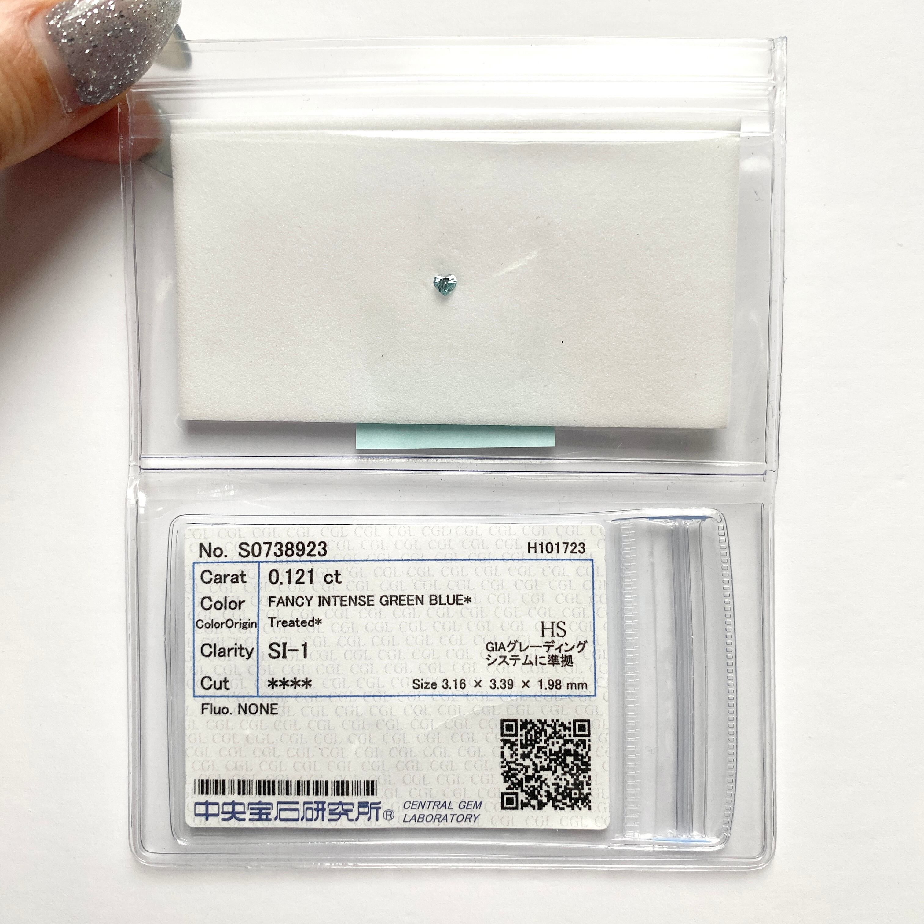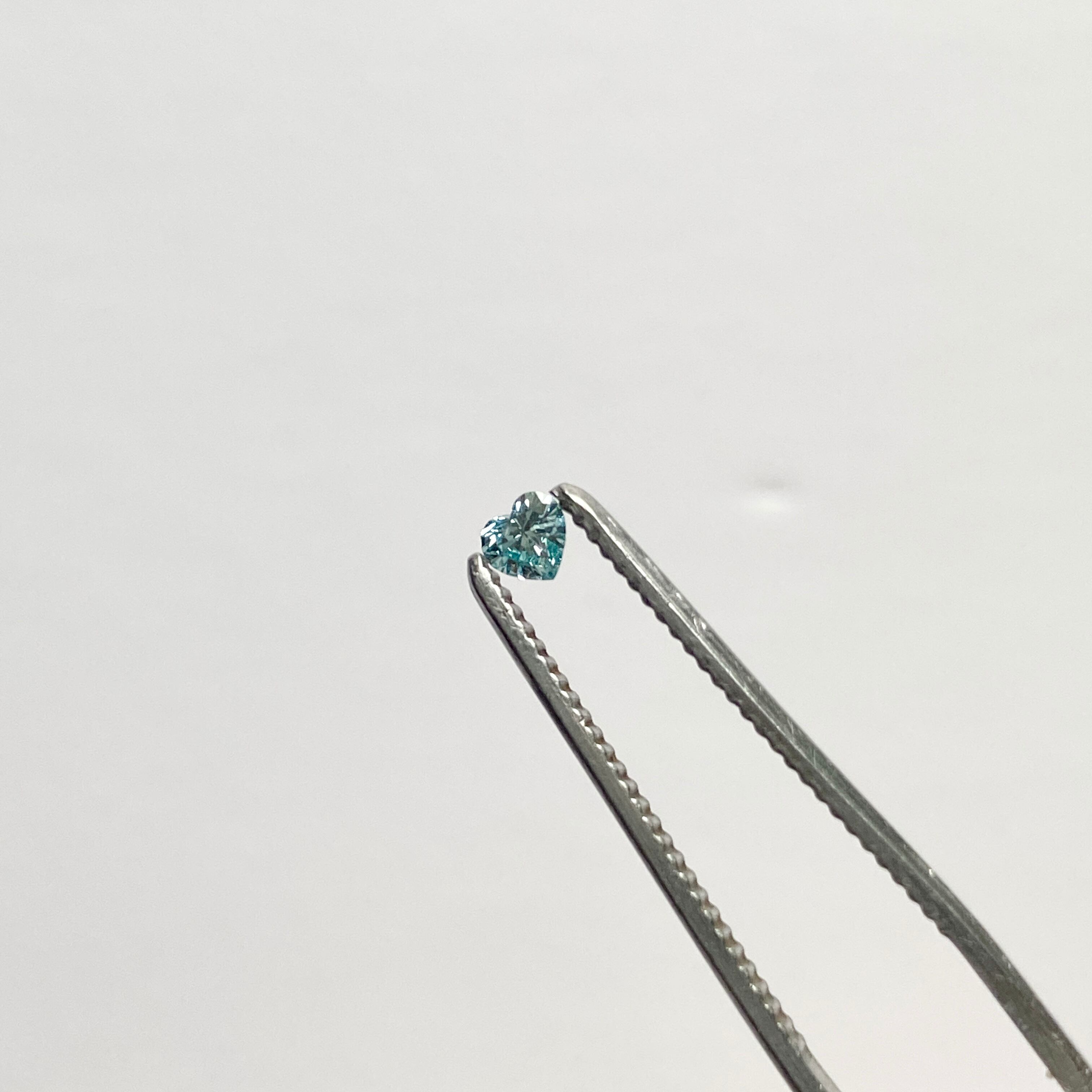 こちらは、0.121カラットのハートシェイプブルーダイヤモンドです。ハートシェイプカットは、ロマンチックなフォルムが特徴で、愛や幸福を象徴するデザインとして人気があります。